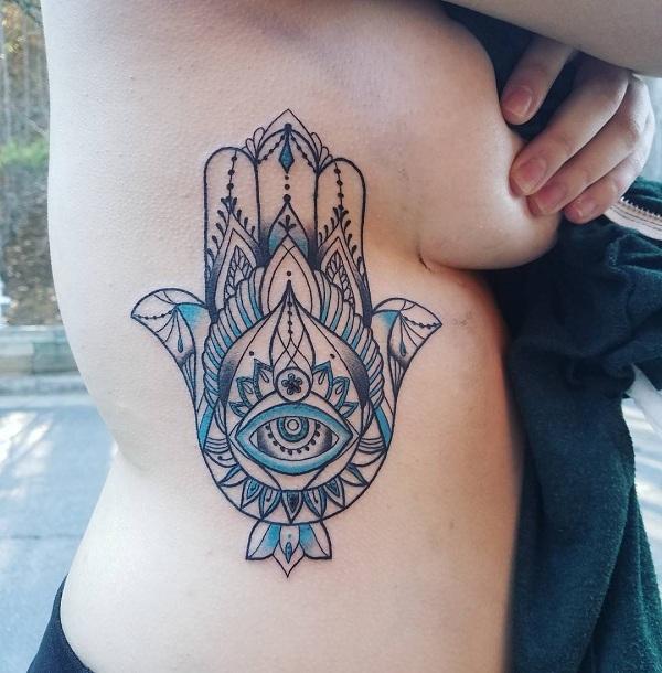 What a cute hamsa tattoo on the side among the blue roses with green leaves! Black hamsa contrasts nicely with blue eye and roses to emphasize the controversial nature of the bearer.