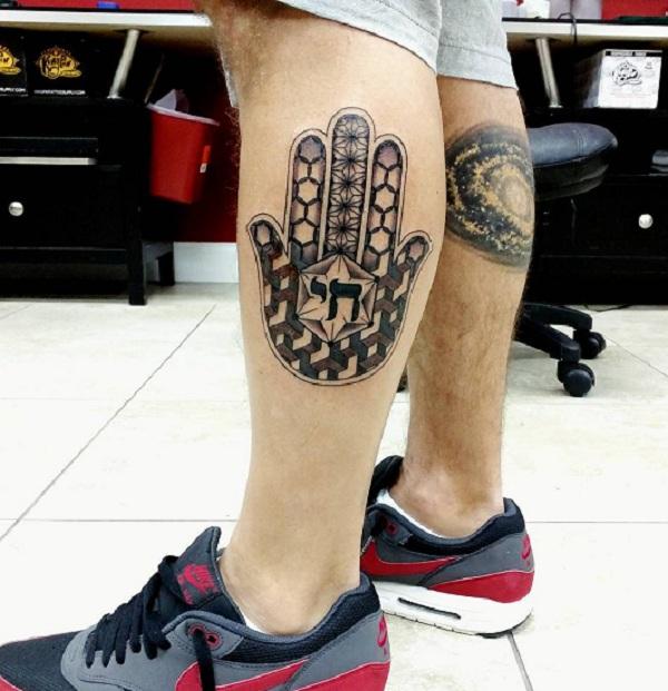 Hamsa tattoo on the leg in a 3D style is a mixture of ancient and modern.