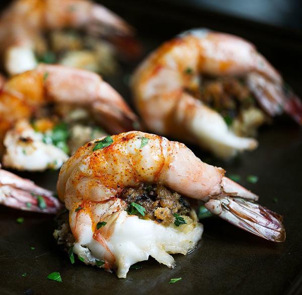 This shrimps with cracker and crab filling serve with parsley and lemon wedges around them.