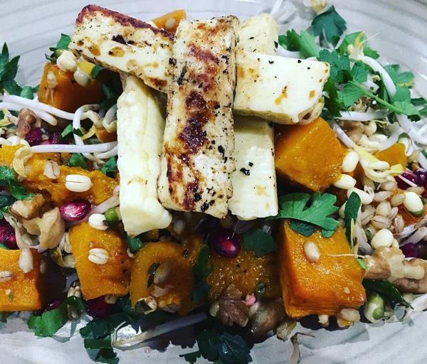 Caramelised roast Pumpkin, Pumpkin seeds, grains, parsley, pea shoots and walnuts smothered in a subtle pomegranate dressing accompanied