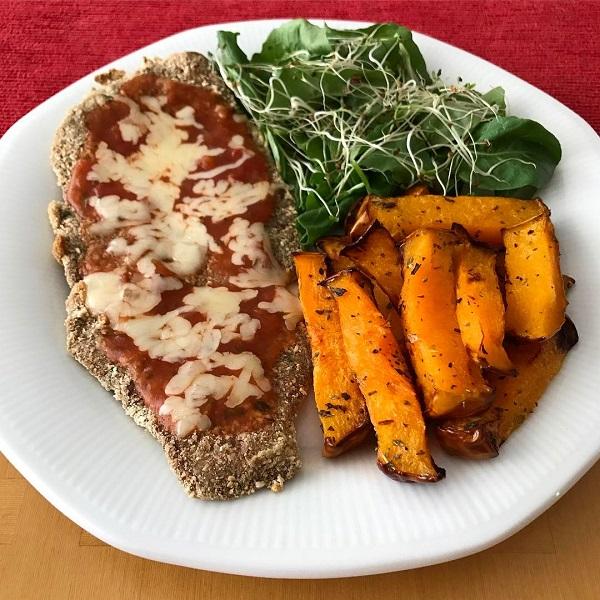 Meat milkshake with tomato sauce and freshly baked non-fat cheese Pumpkin sticks with oregano Arugula salad and alfalfa sprouts.