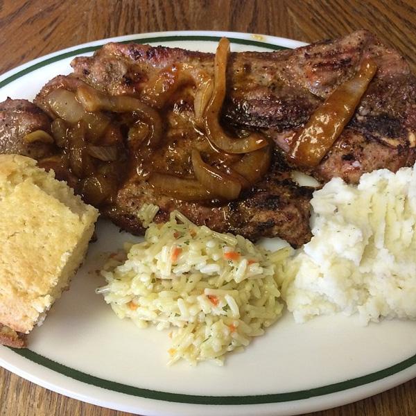 Delicious steak with port sauce made of onion, with the addition of mashed potatoes and rice will please all your guests and your stomach for sure!