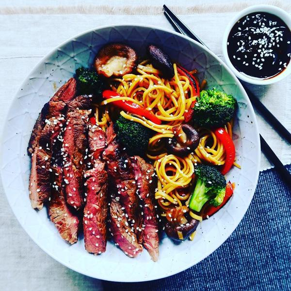 Teriyaki steak with broccoli & shiitake mushroom noodles