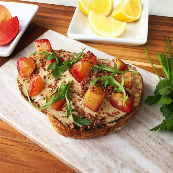 Slices of perfectly cooked steak, balsamic-glazed mushrooms, whipped goats cheese butter, crusty bread.