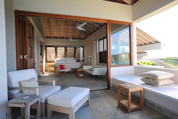Two infinity salt-water pools define the exterior of this uncanny retreat, giving it a distinct geometric character. At one end of the property is the master suite pavilion, with its own private cocktail pool. Next up, there are four equally-sized bedroom/bathroom pavilions in a row, each suite having its own private entrance and parking, a sitting area, and a private covered patio for two overlooking landscaped gardens and the sea.