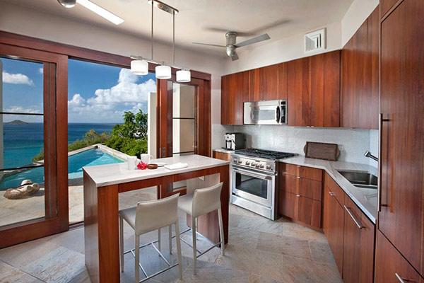 At the other end of the property is the main pavilion, which accommodates dining and sitting areas and the gourmet kitchen. The main pavilion also offers a dramatic gallery off to the side, refreshed by cooling island sea breezes, for dining or lounging with a view. Right below the main pavilion is an air-conditioned home gym with a treadmill, a universal weight machine and yoga mats.