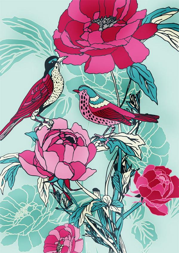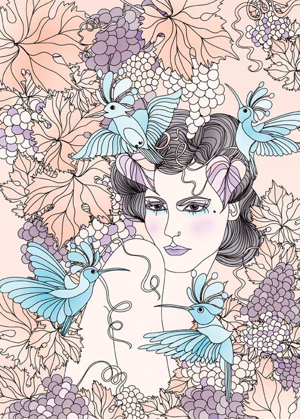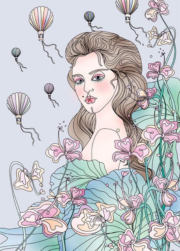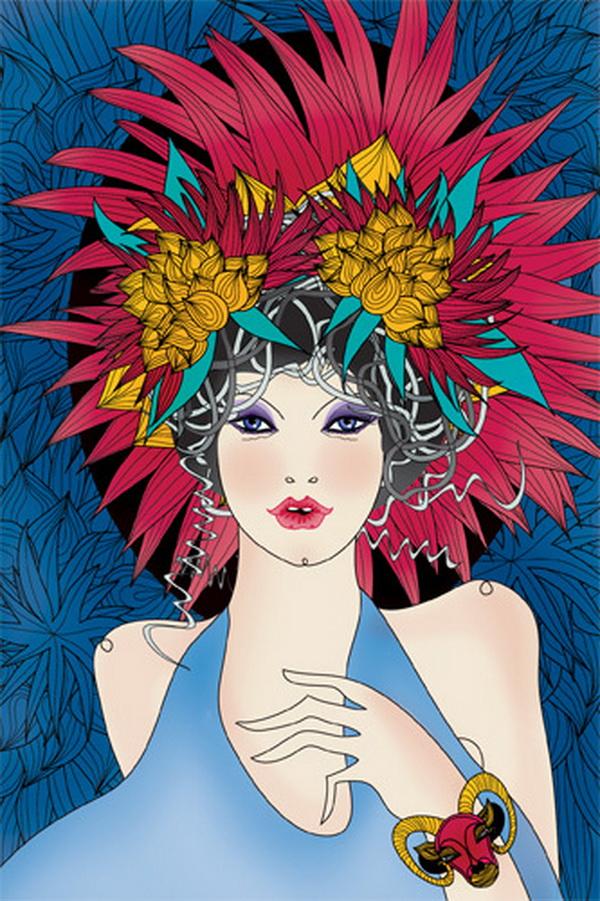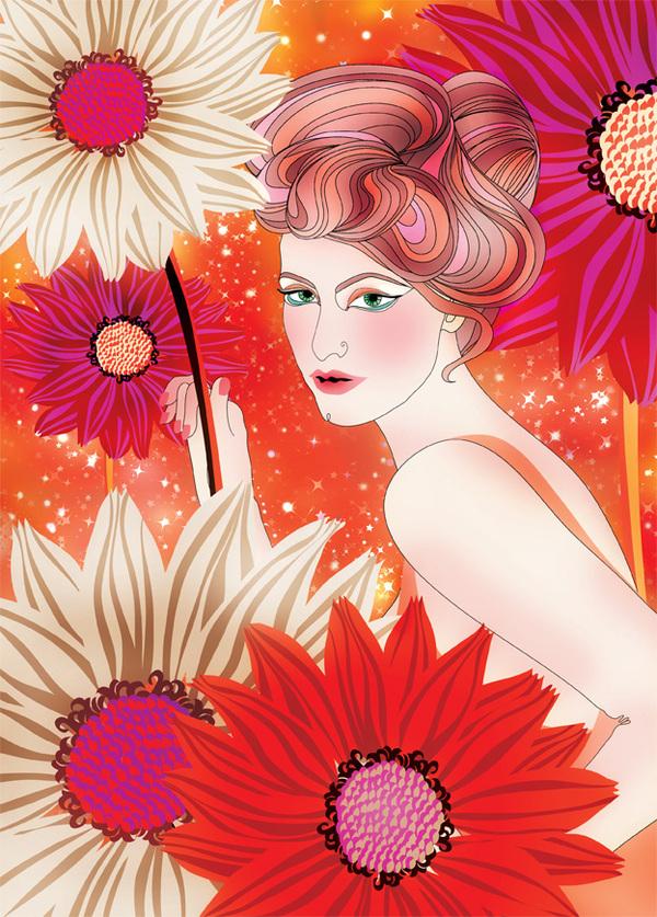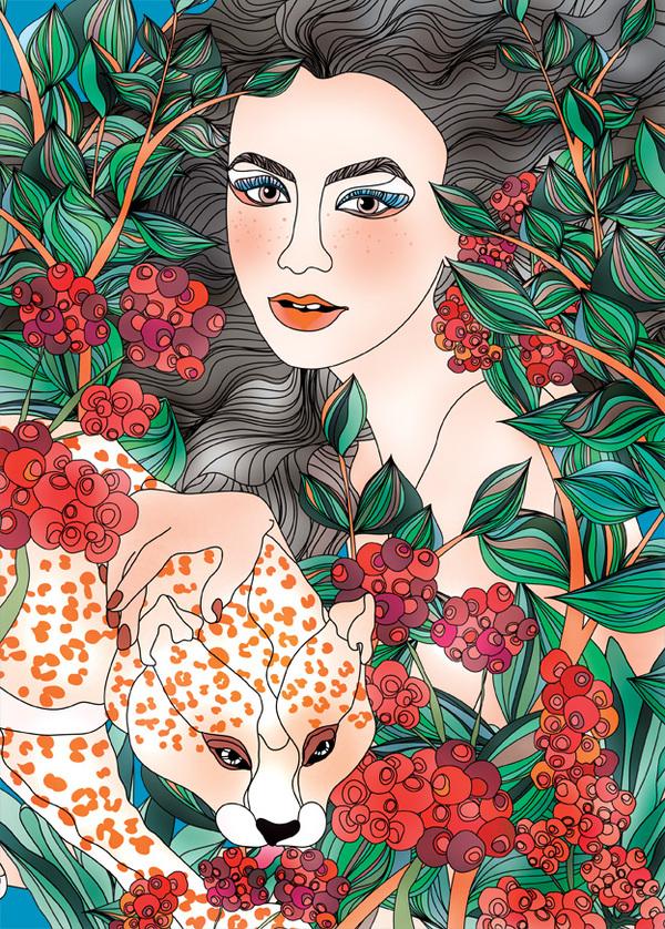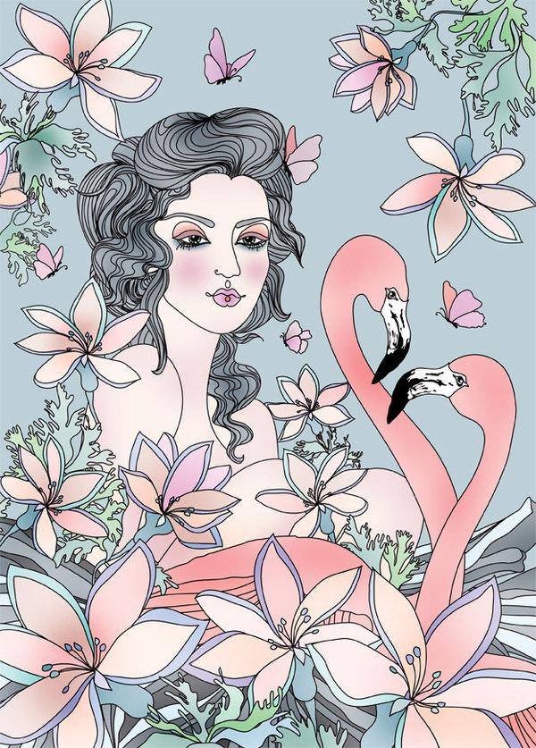 Inspired by fashion, nature and flowers, Zurich, Switzerland based illustrator created colorful intricate images balanced elegantly with line and flowing shapes.