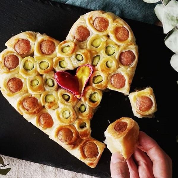 Make rolls with sausages, cheese or some ingredient that you like the most and arrange them as it is illustrated. The dough for the rolls you can knead with the help of, naturally, flour, yeast, eggs and water, with the mandatory addition of warm milk, and oil (that will make the dough smooth and soft). Salt and sugar also put somewhere in the proportion of 2: 1. Leave it to advene, knead it once more, and let it again. After half hour or 1 h it is ready for rolling sausages or cheese.