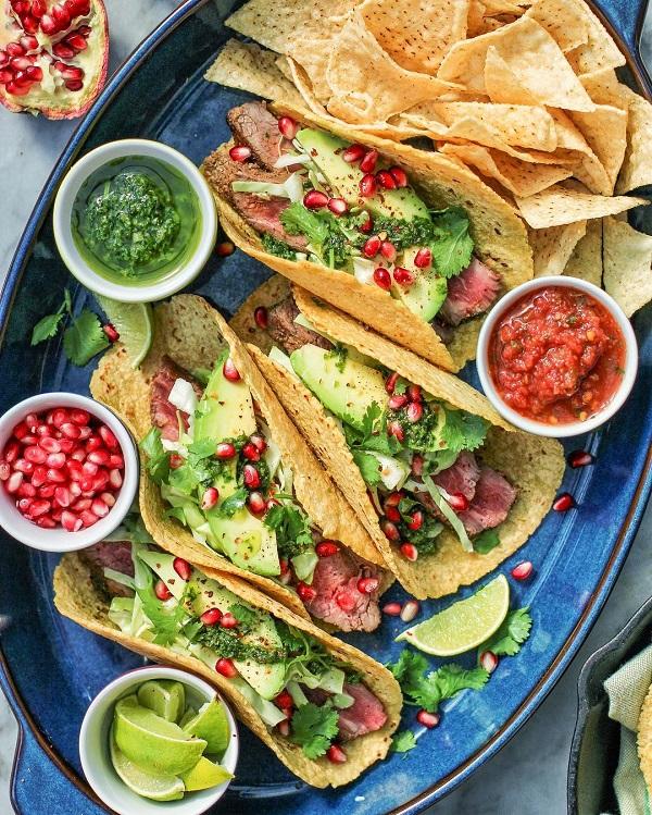 Spice rubbed grilled flank steak tacos with chimichurri sauce, green cabbage, avocado and pomegranate seeds