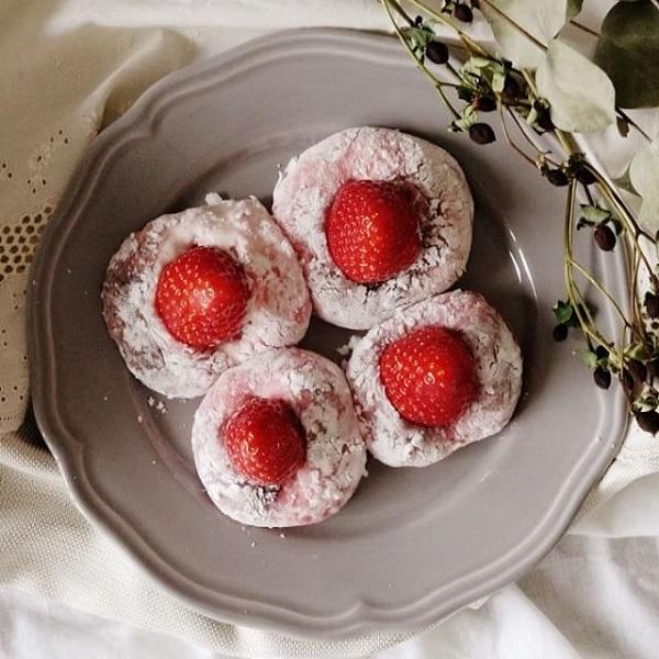 This mochi is filed with milk cream made of cream cheese, strawberry jam and powdered skim milk. In the middle is the strawberries as decoration.