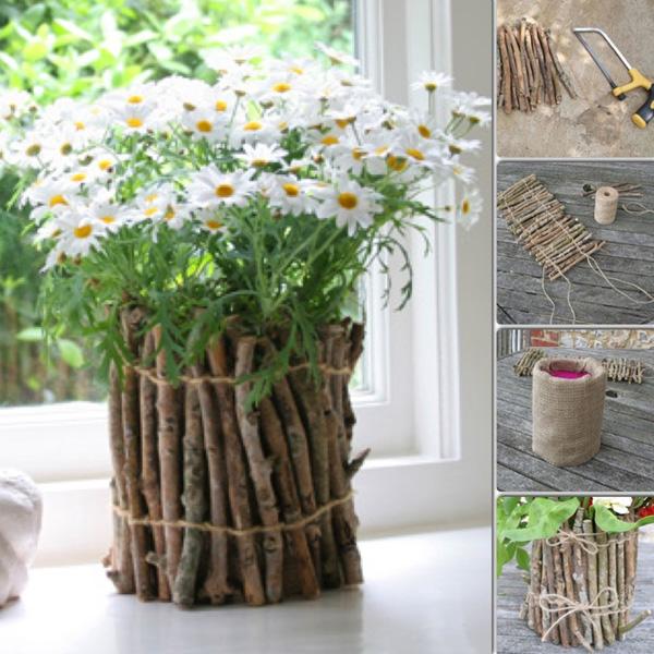 Flowers are a very beautiful decoration of any home, it gives him life and warmth. The thin wooden sticks is used to coat ordinary and boring pots and add creative idea to decorate the balcony.