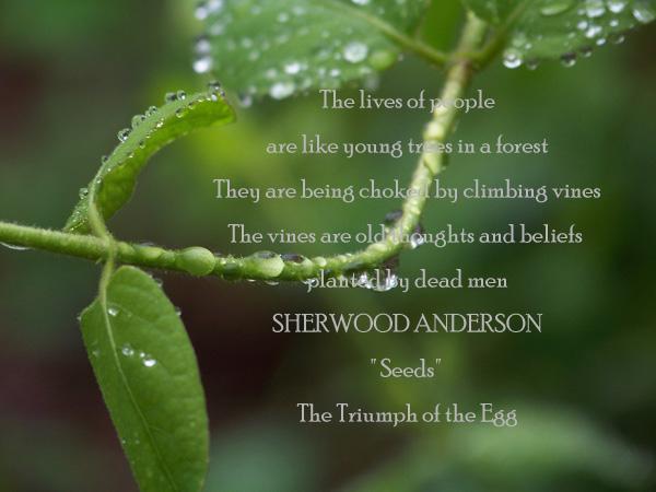 The lives of people are like young trees in a forest. They are being choked by climbing vines. The vines are old thoughts and beliefs planted by dead men. ~ SHERWOOD ANDERSON, “Seeds,” The Triumph of the Egg