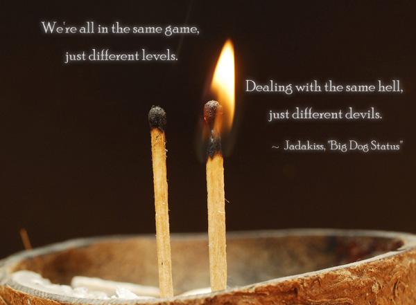 We’re all in the same game, just different levels. Dealing with the same hell, just different devils. ~ Jadakiss, “Big Dog Status”