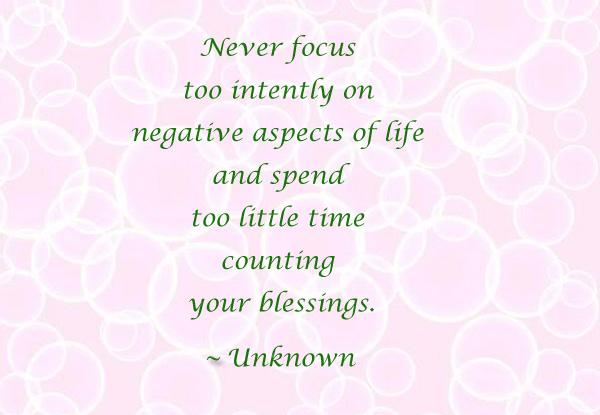Never focus too intently on negative aspects of life and spend too little time counting your blessings. ~ Unknown