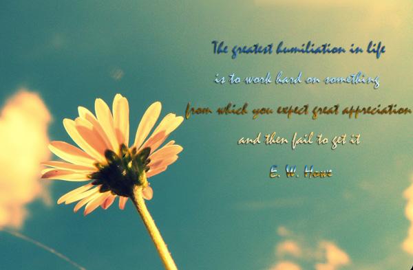 The greatest humiliation in life, is to work hard on something from which you expect great appreciation, and then fail to get it. ~ E. W. Howe