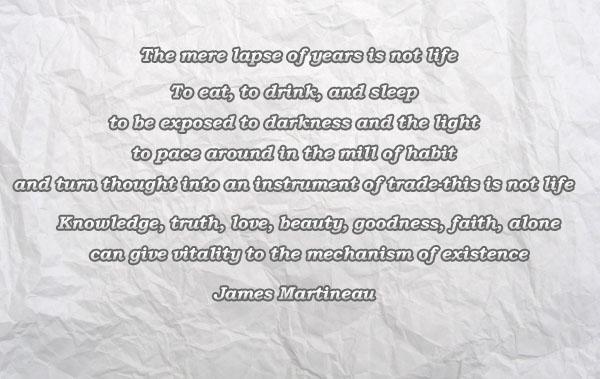 The mere lapse of years is not life. To eat, to drink, and sleep; to be exposed to darkness and the light; to pace around in the mill of habit, and turn thought into an instrument of trade-this is not life. Knowledge, truth, love, beauty, goodness, faith, alone can give vitality to the mechanism of existence. ~ James Martineau
