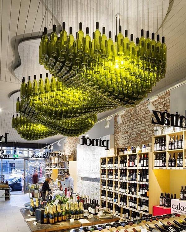 This brick wall certainly contribute to the overall impression of the interior design, but much more dominant are the bottles on ceiling between which are light bulbs – together look like huge chandeliers!