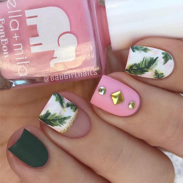 Very bold combination of baby pink and extravagant green. Dark autumns and hot summer color are balanced and you can wear this manicure even when colder days come.