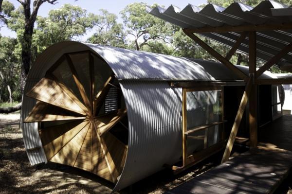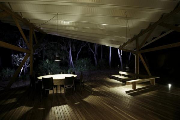 Living and sleeping pods along with a bath house were built in Brisbane, close to construction services and transported the 500km to site fully completed. The prefabricated parabolic roofed structure and decks were erected onsite and connect the various pods through a large central outdoor living and dining area. Aramax roof sheeting free spans the two identical, but reversed, hardwood self-braced trusses.