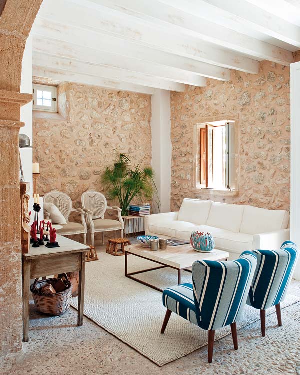 The Mediterranean villa you can see in the photos was designed by Mestre Paco and it reveals the concept of living without borders in a natural, comfortable environment. The stone facade, punctuated by wooden shutters, creates a picture-perfect exterior, accentuated by the use of simple patio furniture in the garden.