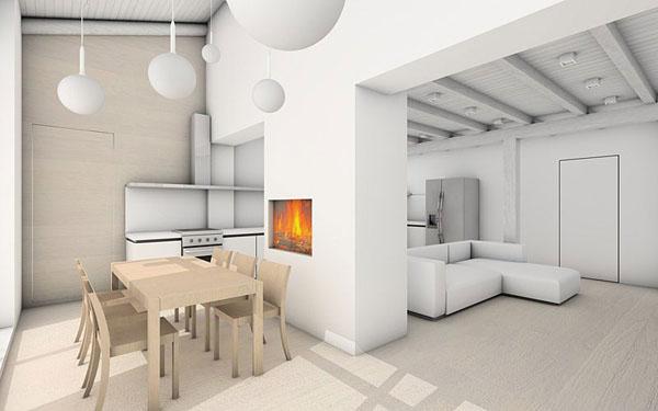 A bright, elegant downstairs living/dining/cooking area seems to be separated by a wide column pierced by a transparent fireplace, but the fluid spaces appear strongly connected. Wooden floors reflect in the wodden ceiling, displaying the same longitudinal design that seems to elongate rays of natural light coming through glass doors and windows. Ego Vitamina Creativa imagined a living space where design lines intertwine to shape a dark wooden piece of furniture running alongside the wall opposite the kitchen.