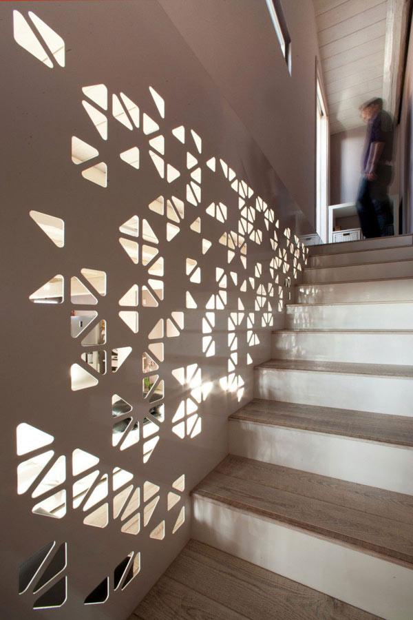 This versatile construction acts as a storage space and supports the folded, painted and perforated metal staircase railing leading to the upstairs bedroom. This unique feature completes the apartment’s design and the floor plan proves that careful space arrangement also needs a focal point to create an interesting interior design.
