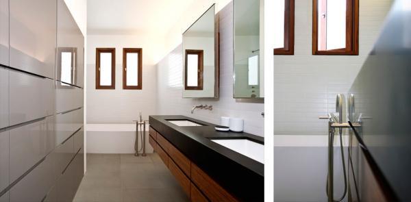 The House itself takes advantage of these two exterior spaces, interior courtyard and exterior view, with a wrapper of sliding doors that, when open, turn the house into an outdoor pavilion. A juxtaposition of lacquered cabinetry set against painted brick walls, and aged wood floors against stark white walls further emphasize the balance of sophistication and style that make up this home.