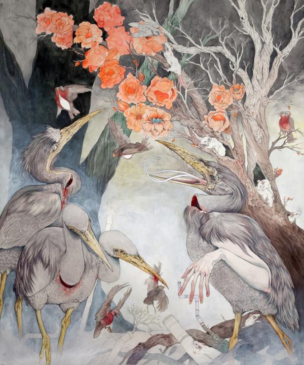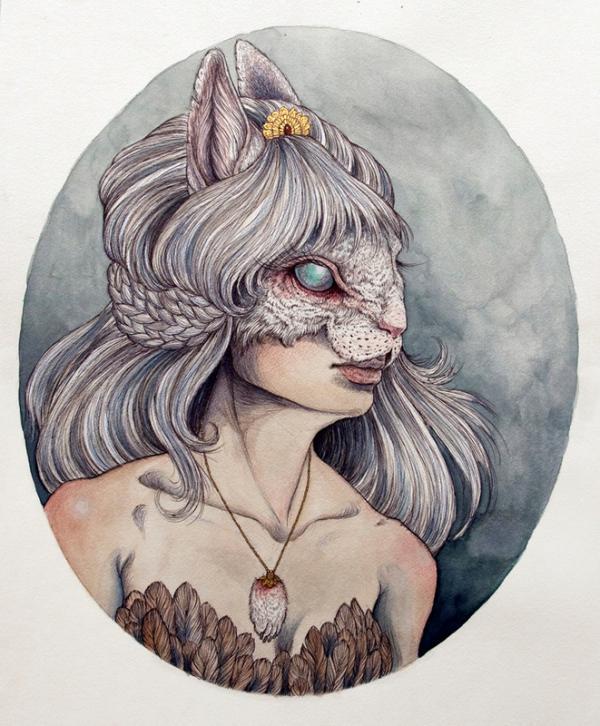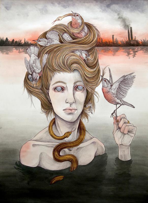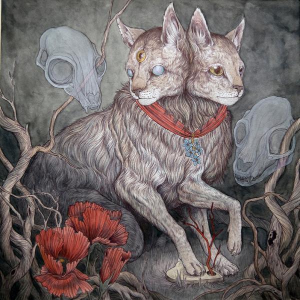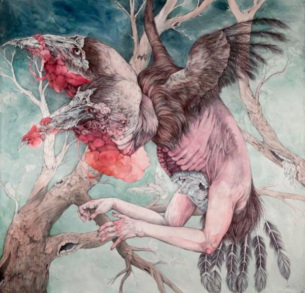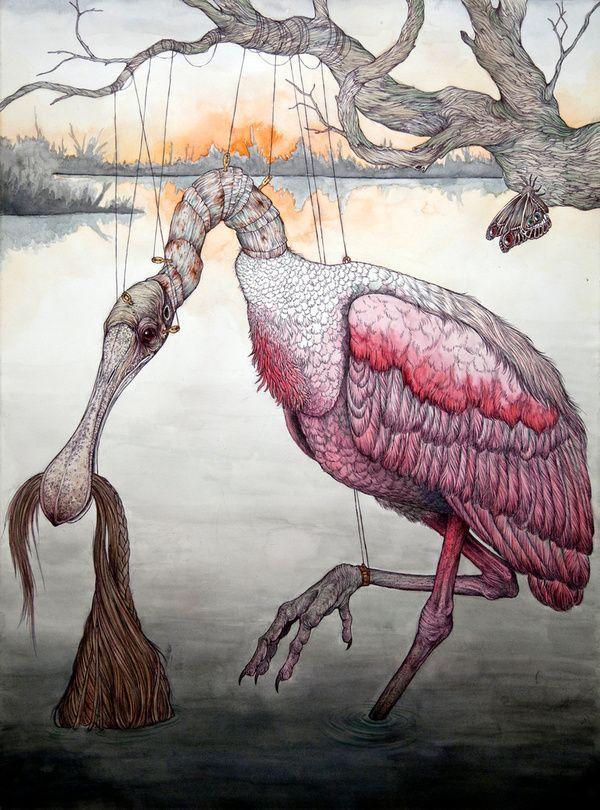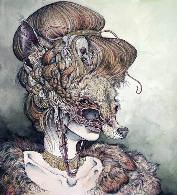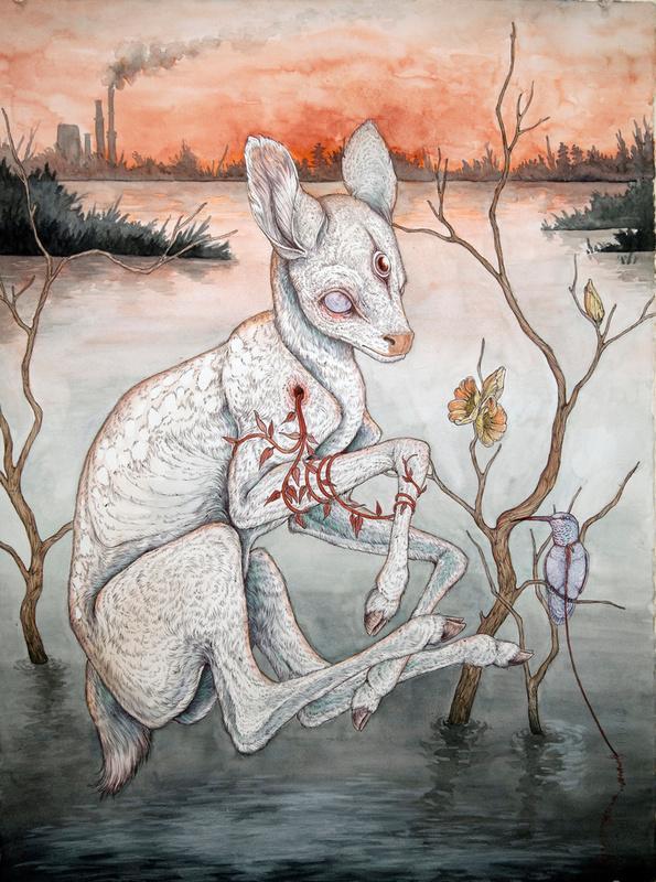 I create pseudo-mythical, mutated, and anthropomorphic creatures using ballpoint pen and watercolor as my primary mediums, almost exclusively on paper. With my work I attempt to capture the often volatile human-animal relationship. I am faced with the fact that we live in a planet in decline, where nearly every natural ecosystem in the world is withering away. Human kind has created a planet of refugees; animals forced to flee ever farther from the insatiable encroachment of urban development, victims of a war for space which they cannot hope to win.