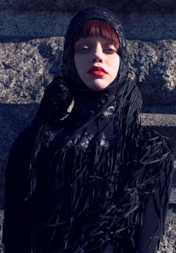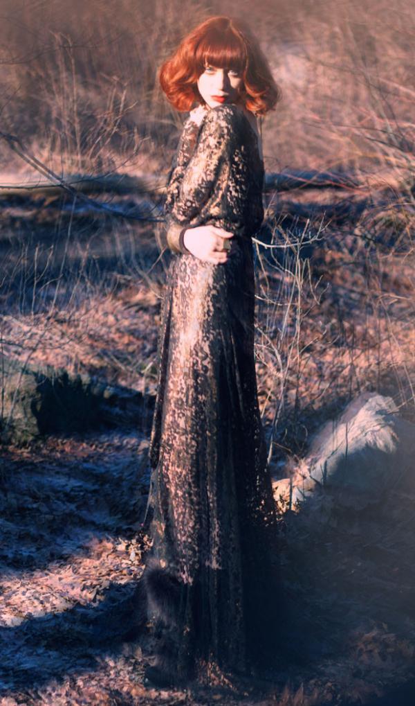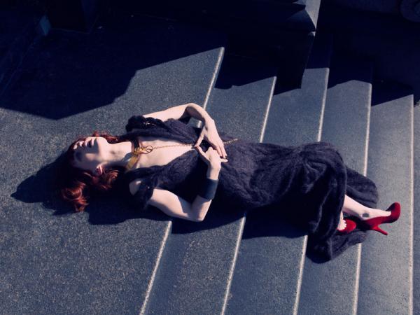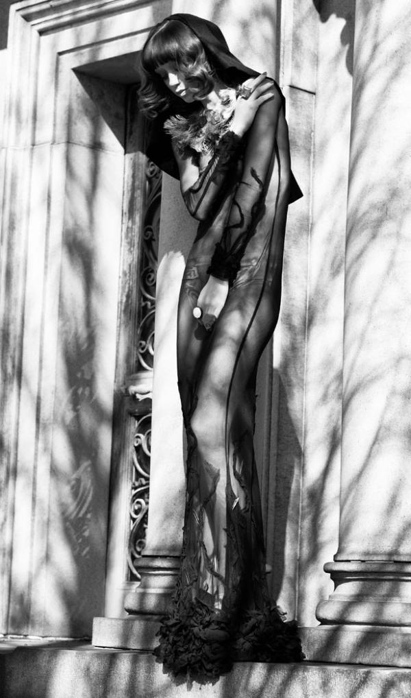 Judith Bedard by Grant Yoshino for Fashion Gone Rogue. Photographer Grant Yoshino and stylist Newheart Ohanian capture a darkly romantic spring story shot for FGR’s most recent exclusive. Starring model Judith Bedard as the stunning protagonist, the sun-drenched images highlight decorative dresses and gowns matched with glittering accessories. Lush curls by hair stylist Cash Lawless and a red lip by makeup artist Renee Garnes bring a vixen quality to the feminine frocks.