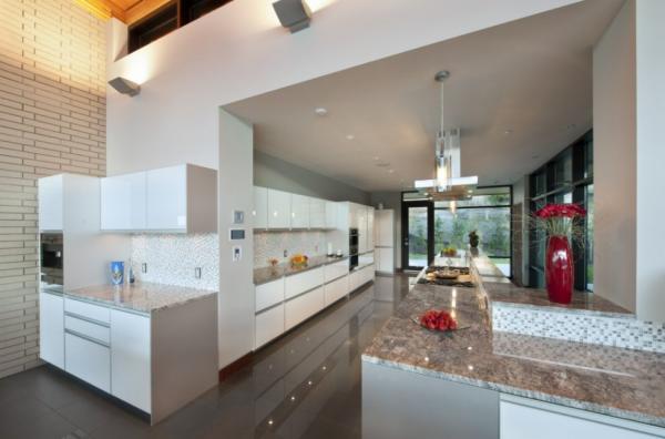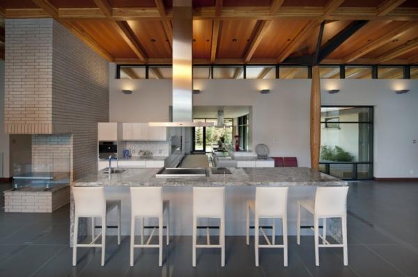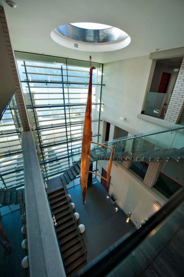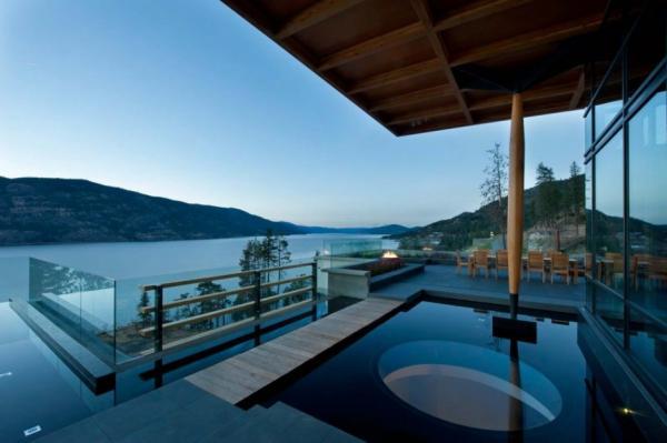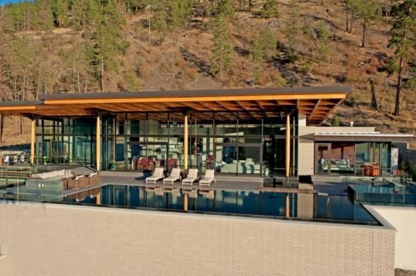 Located near Kelowna, BC, Canada, the residence that received its name from the neighboring city displays a massive brick wall supporting the interior spaces. Overlooking Okanagan Lake, the modern and imposing residence gathers views from many vantage points, both interior and exterior. Wood columns on the upper terrace support large overhangs and add an interesting character to the upper floor pavilion containing the social and entertaining areas, as well as the master bedroom. An infinity pool completes the luxurious features of this home.