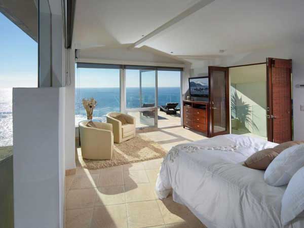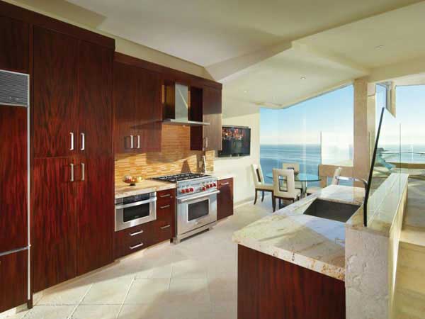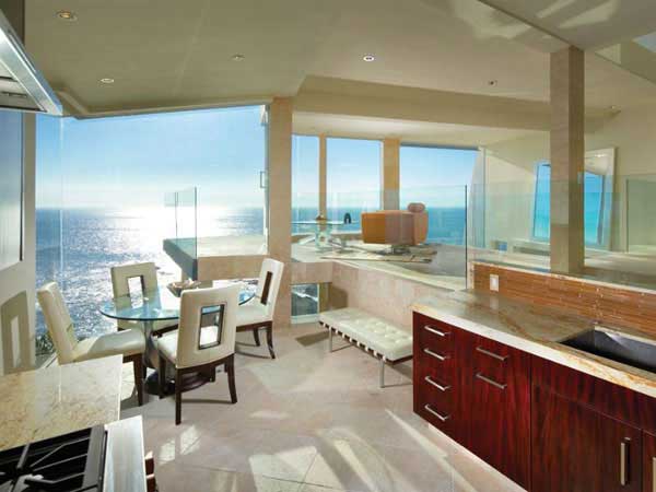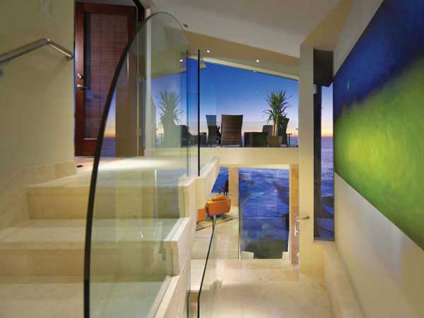 An open gourmet kitchen with stainless steel appliances and imported stone flooring – as we can see throughout the house – gathers family around the dining table overlooking calming ocean views. The sloping landscape allowed the architects to construct half-floors that give the impression of a larger, brighter space, separated into interesting horizontal planes, as we can see in the dining/cooking /contemplating space. From high up, a bright and elegant master suite opens up to a private terrace. Zig-zag terraces give the ocean facade a fun twist when looked at from the roof.