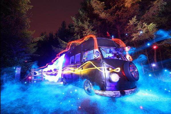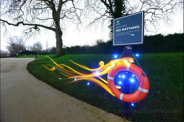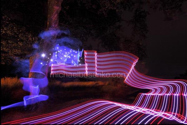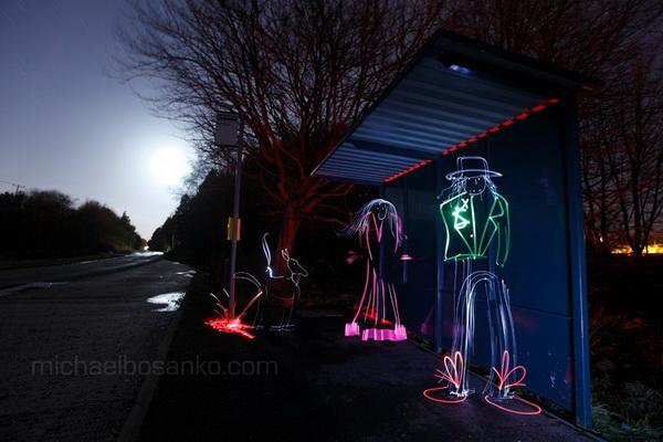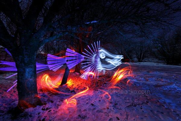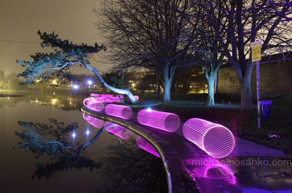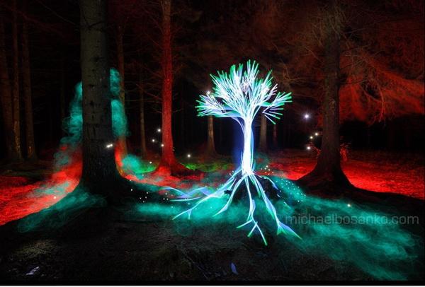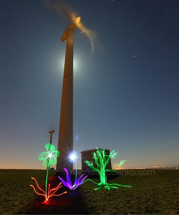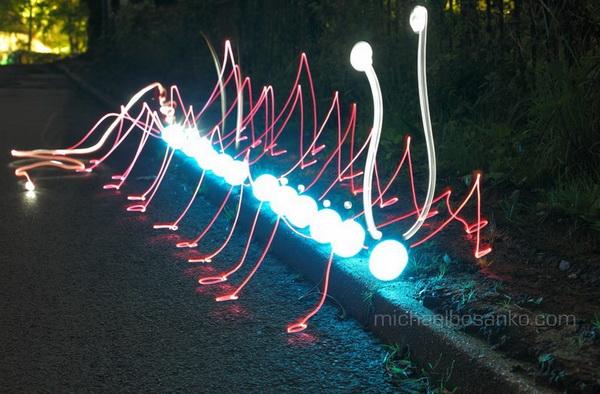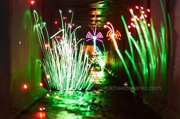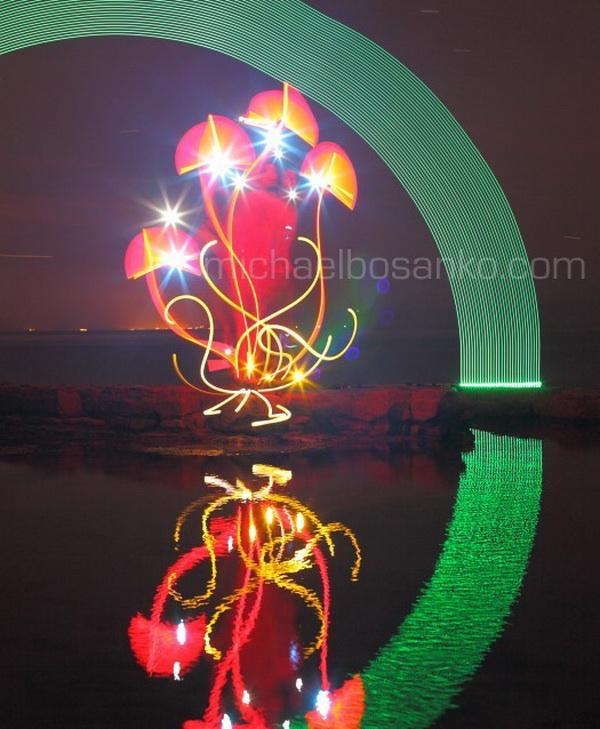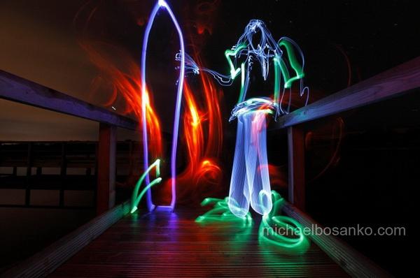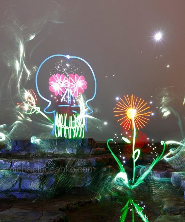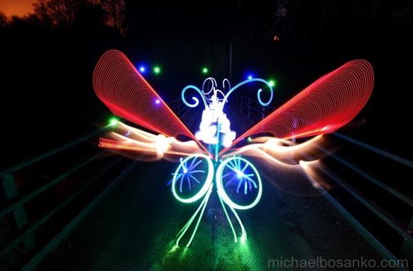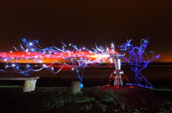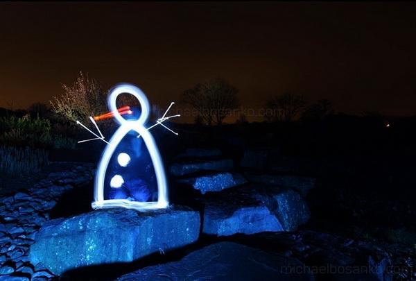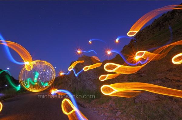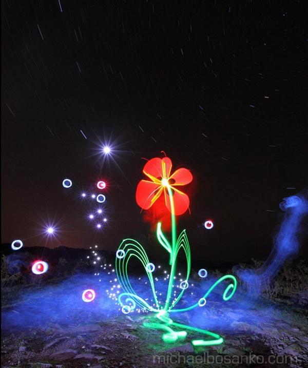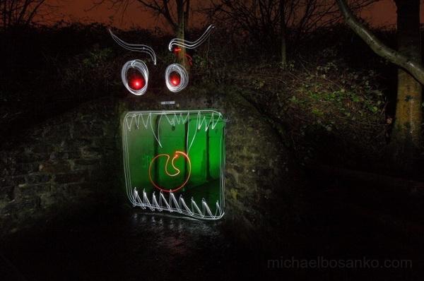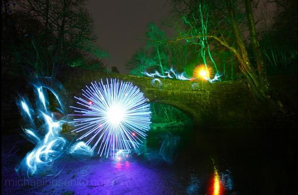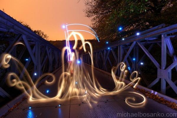 Cardiff, Welsh based artist Michael Bosanko creates the amazing light graffiti effect using simple household torches and by leaving his digital Canon camera on a long exposure ranging from seconds to over an hour.