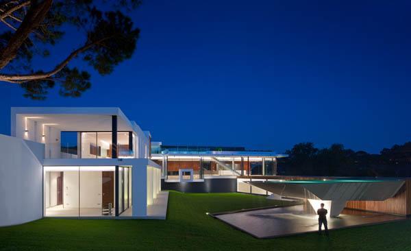 Casa Vale Do Lobo borrows the name from its proximity to the Vale do Lobo luxury beach and golf resort in the Algarve region of Southern Portugal. Focusing attention both on the white architecture pierced by glass walls and on the extraordinary swimming pool, architect Vasco Vieira of Arqui+Arquitectura composed a light-flooded modern architectural masterpiece.