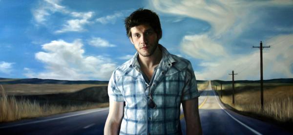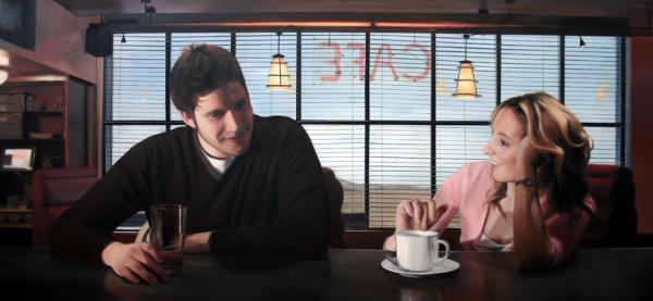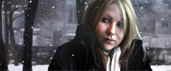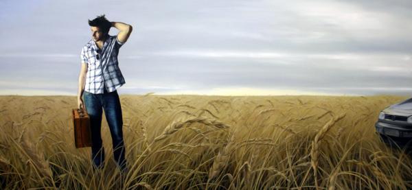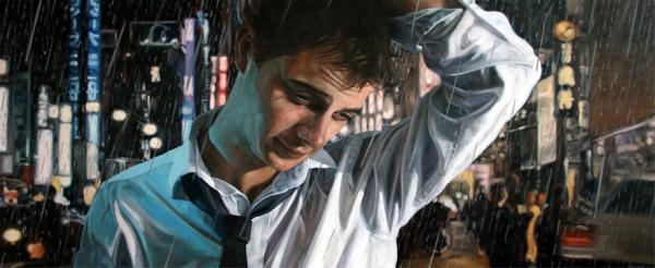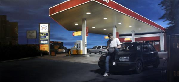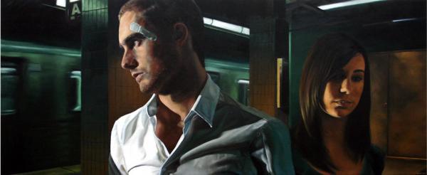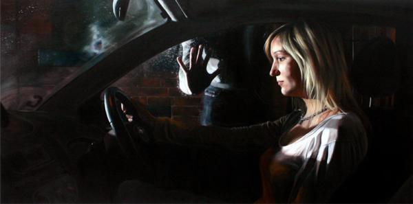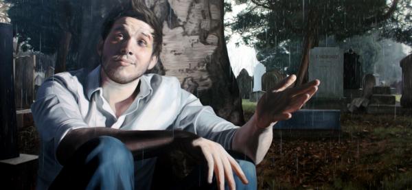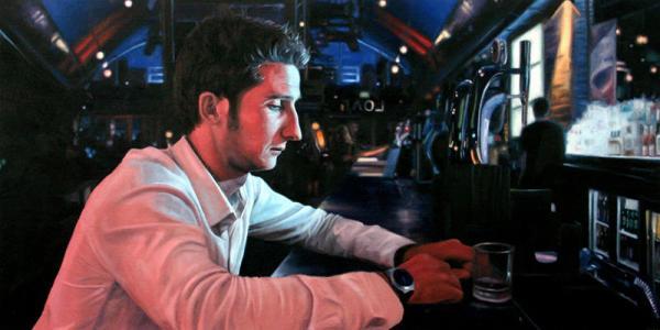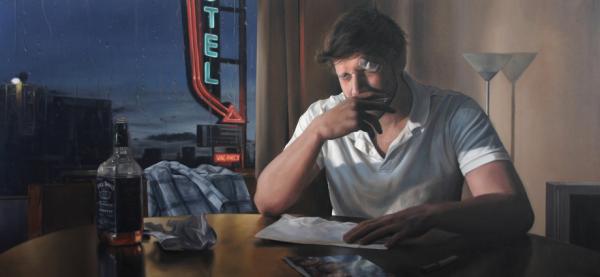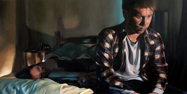 Joe Simpson is a figurative painter currently living and working in London. His paintings have been shown both nationally and internationally, including prestigious venues such as Urbis, Manchester City Art Gallery, Cornerhouse and The House of Commons. Joe works primarily in oil paint to create realistic images that utilise the conventions of cinematography to present ‘staged’, fictitious scenes where time has been stopped and extended. These frozen moments are deliberately ambiguous, inviting the viewer to inject their own emotions, motivations and narrative context into the scene, thereby avoiding limiting interpretation.