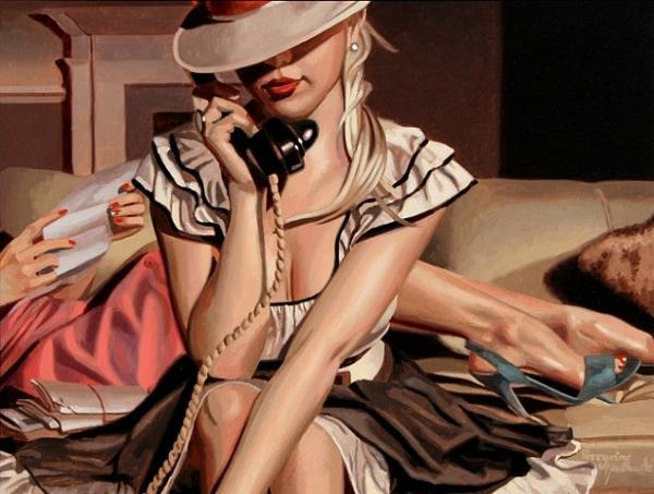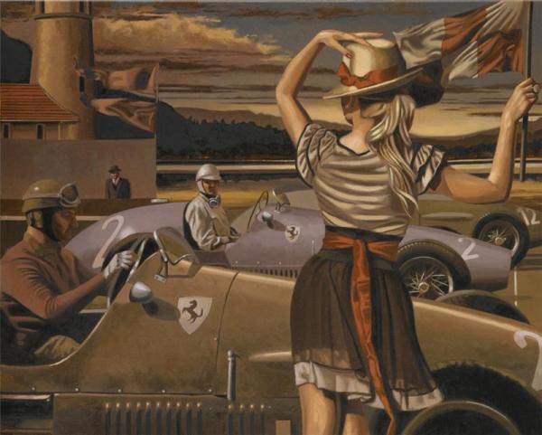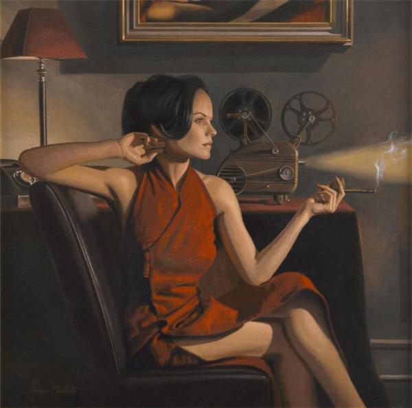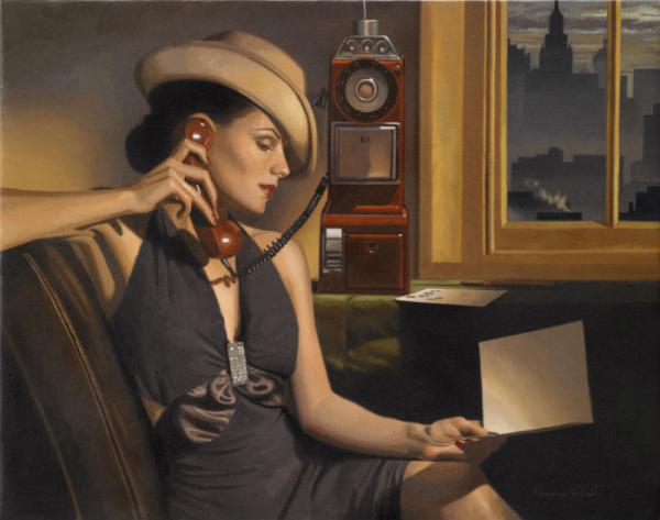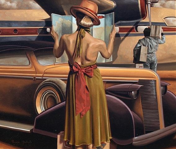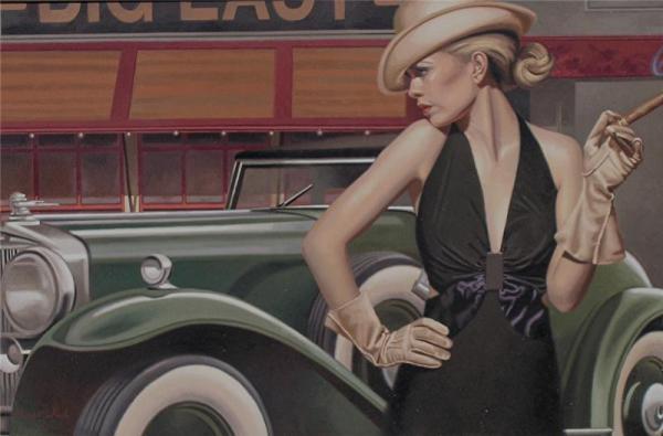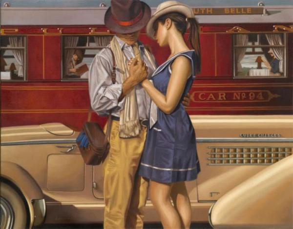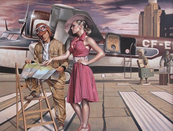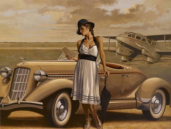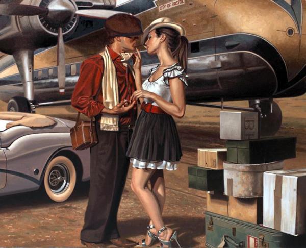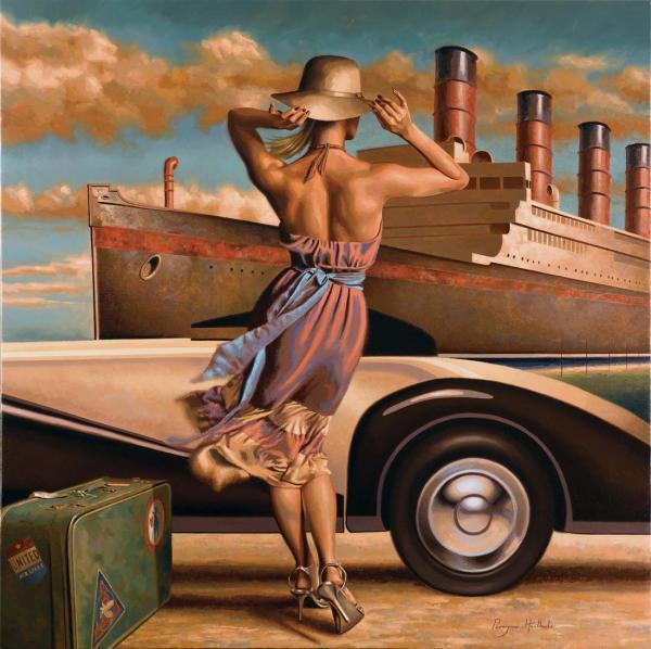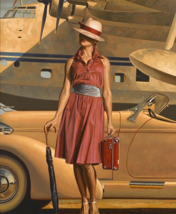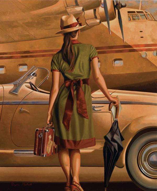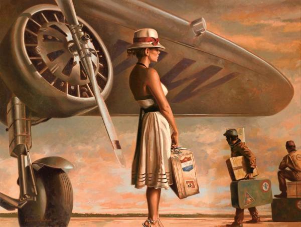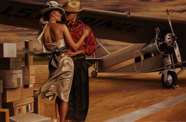 Born in London in 1973, Peregrine Heathcote spent his childhood living in both Britain and Dubai where his imagination was free to flourish as he witnessed an international jet set culture. Hence it is no surprise that the artist’s imagery reflects a provocative Silver Screen theatrical quality. In 1995 Peregrine graduated from the Florence Academy of Art and since that time he has been profiled by the BBC in a documentary about his portraits resulting in international exposure. Heathcote’s images of beautiful women stepping off bullet trains in addition to his Gatsby-esque characters embarking on luxurious voyages via vintage aircrafts and cruise ships, conjure a world of intoxicating glamour and intrigue. The artist uniquely blends a sense of nostalgia with the contemporary world while creating narrative stories in paint. Notably, he has exhibited at the Royal Society of Portrait Painters, the Royal Academy, and Hampton Court. In addition his paintings have been auctioned at Christie’s Auction House, King Street, London. Presently Peregrine is including Newbury Fine Arts as a primary source for his artwork in the East Coast of the United States.