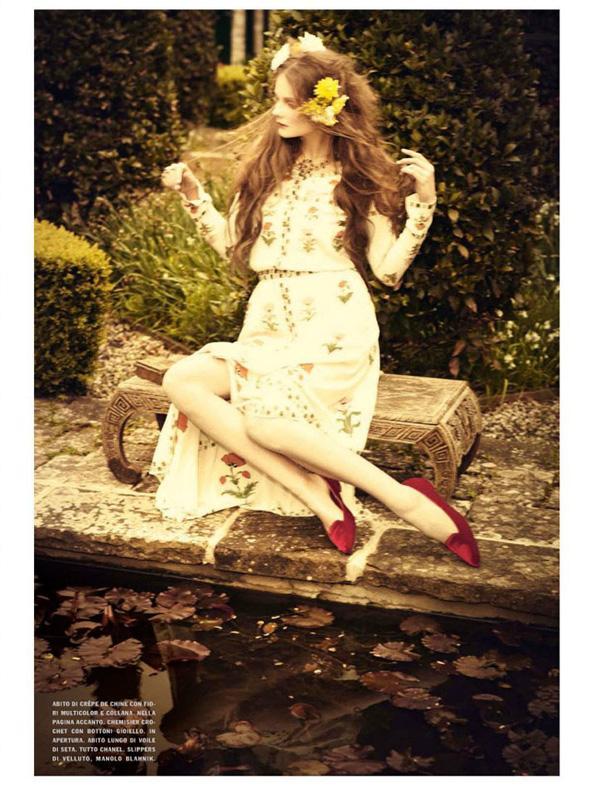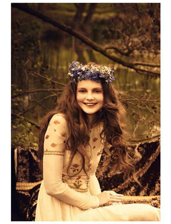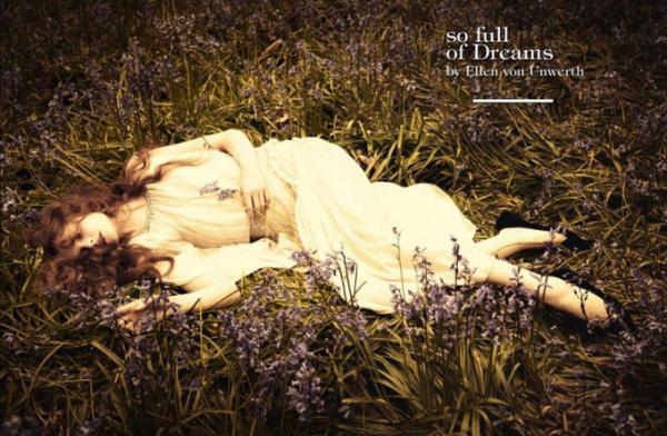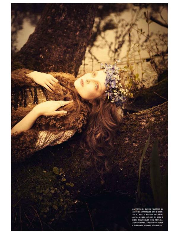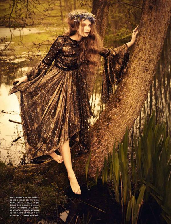 So Full of Dreams – Captured by Ellen von Unwerth, Hungarian beauty Eniko Mihalik takes to the woods for this enchanting story featured in Vogue Italia’s July issue. Eniko dons a wardrobe of lightweight dresses and sparkling jewelry from Chanel selected by stylist Leith Clark. / Hair by Samantha Hillerby, Makeup by Sam Bryant, Set design by Andrea Cellerino
