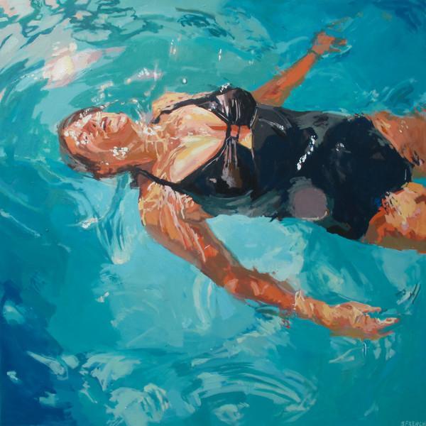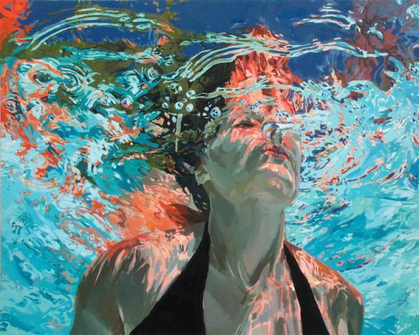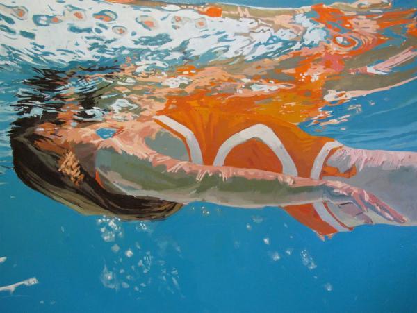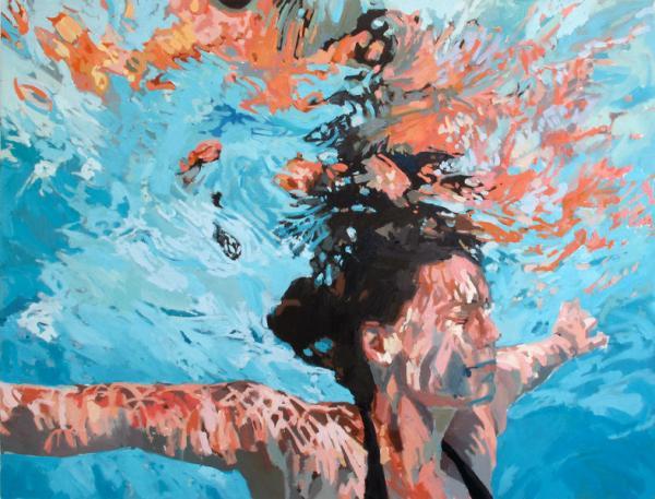 My current body of work is focused on swimmers underwater and above. Using vague yet consuming memories from my childhood summers spent immersed in the tepid lakes of northern Minnesota, I attempt to recreate the quiet tranquility of water and nature; of days spent sinking and floating, still and peaceful…