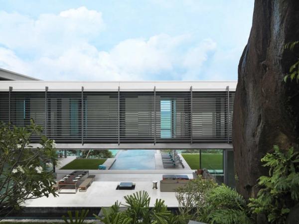 The defining elements are the rock and the view. They dominate at every juncture. They resonate on first approach, through the migration from public to private space, in the living and in the family areas, in the gardens, in the bedrooms; and they continue to command respect down the tropical jungle steps that arrive at a secluded rock platform, flanked by the same seam that welcomed you 60m above. Constant reference to these elements instills a feeling of solidity that contrasts with the openness of the house, reinforcing the dynamism and vibrancy that pays homage to the magic of the location.