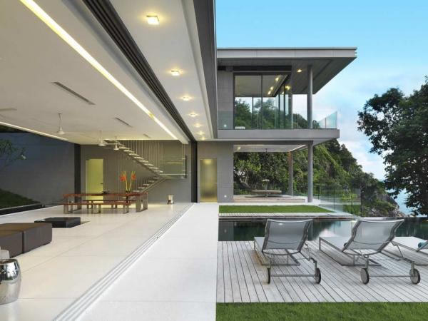 Designed by Original Vision, the Villa Amanzi in Phuket, Thailand, nestled in a cascading, west facing ravine with a dramatic slab of rock defining the northern edge and a stunning outlook over the azure blue of the Andaman Sea to the south.