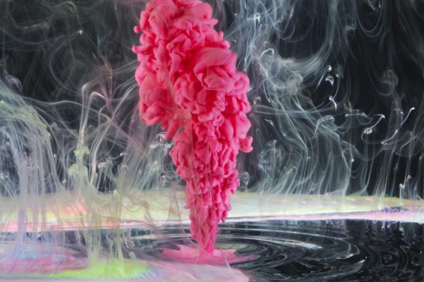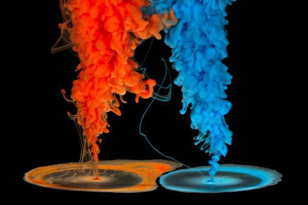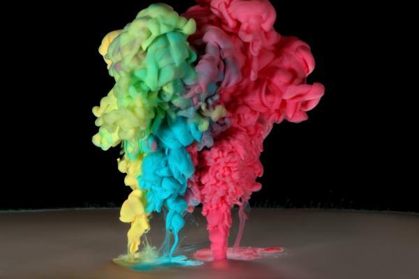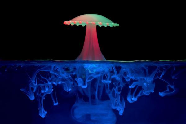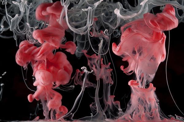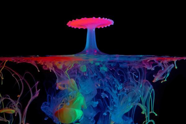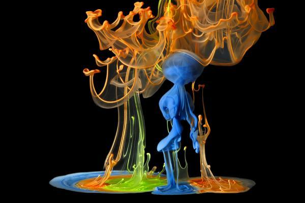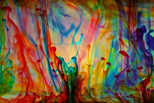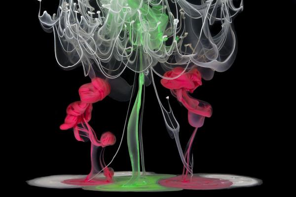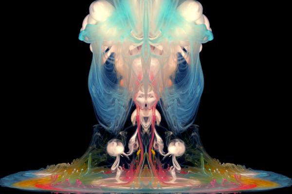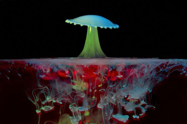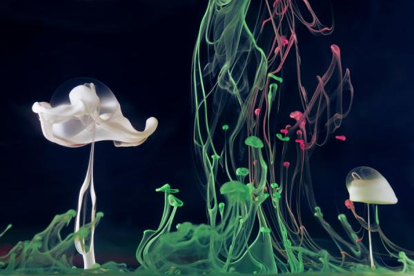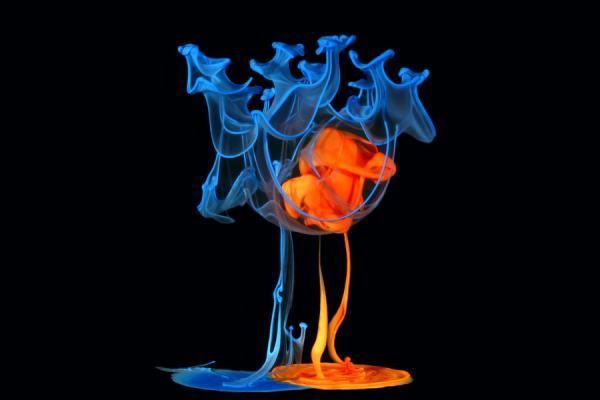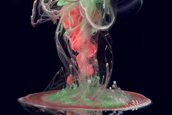 These images are created by dropping cream or water, coloured with food dye, into a small aquarium filled with water. The images are then rotated 180 degrees and enhanced with colour balance, etc