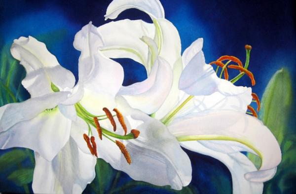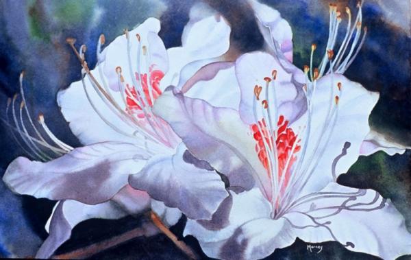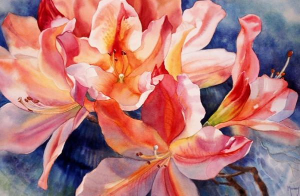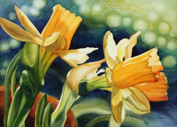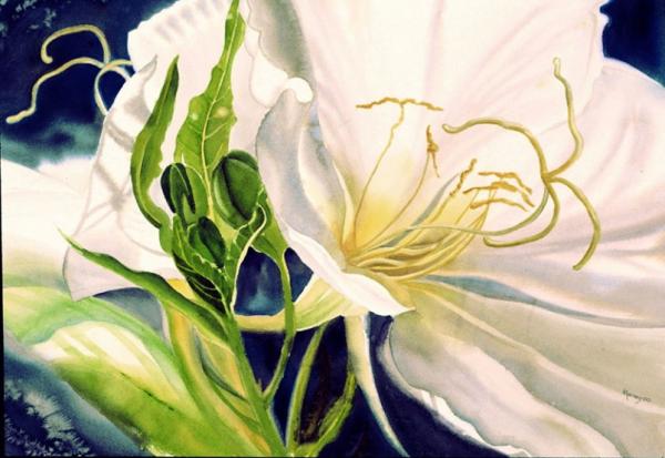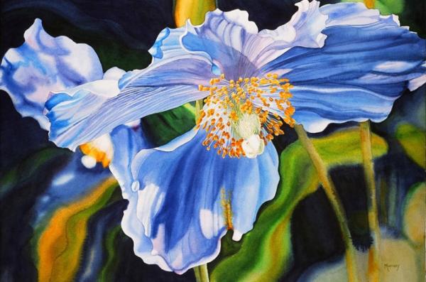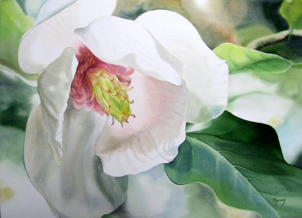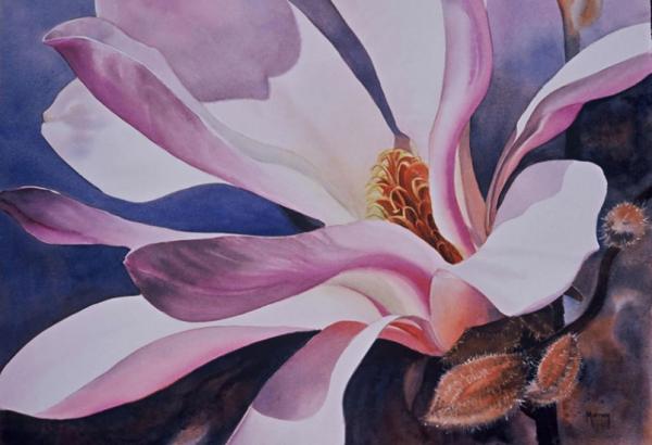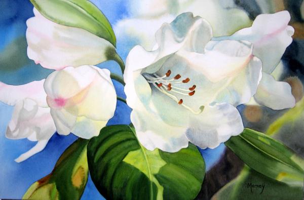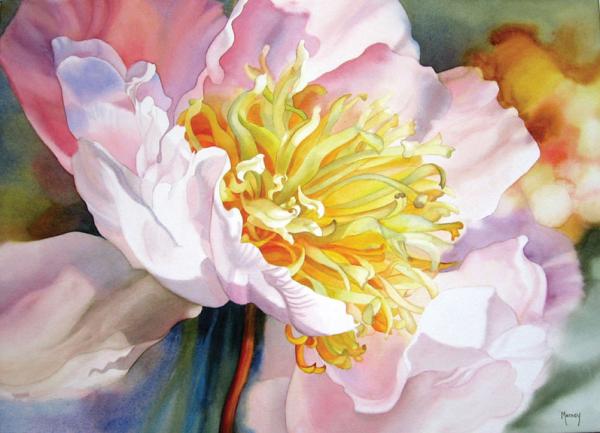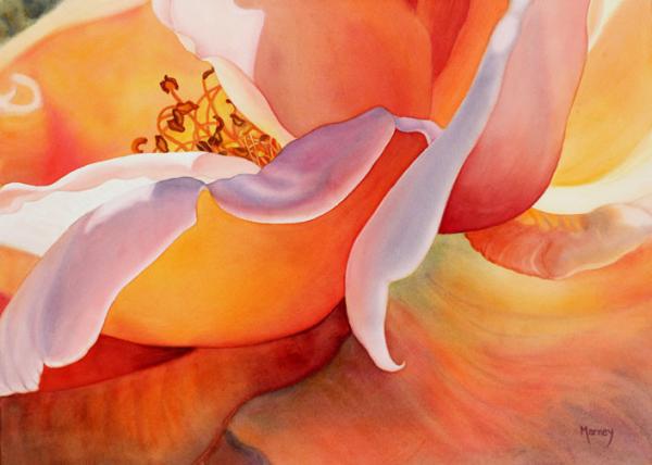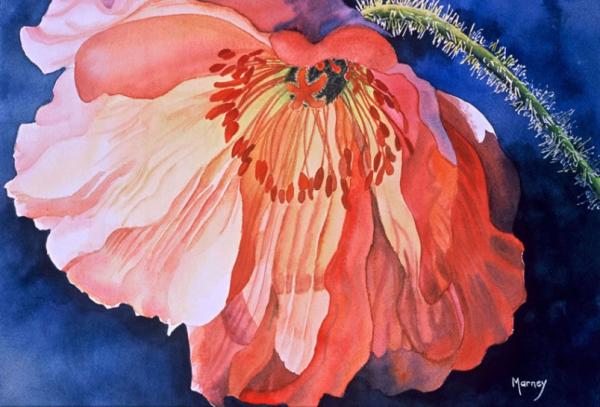 In the early nineties, she decided to revisit her first passion, art. She learned techniques of brushwork and wetness control from classes in Chinese Brush Painting, and from her lifelong mentor Emily Carr, she learned about the struggle to express spirit in art. For Marney, flowers have always had the power to enliven inner joy, so she studied flowers with local artists Caren Heine and Ann Hunter. She went on to develop her own unique style of floral watercolours: large, vibrant, back-lit close-ups that reveal the spiritual essence of the flowers she paints and beyond them, her own spiritual interconnectedness with the natural world. For Marney, watercolour is the perfect medium, with its spontaneous flowing quality and its clear, transparent colour that allows the light of the paper to glow through.
