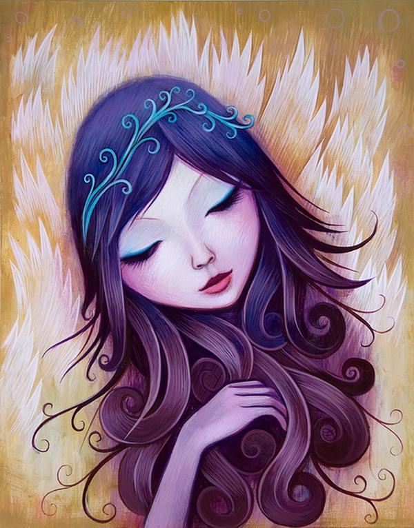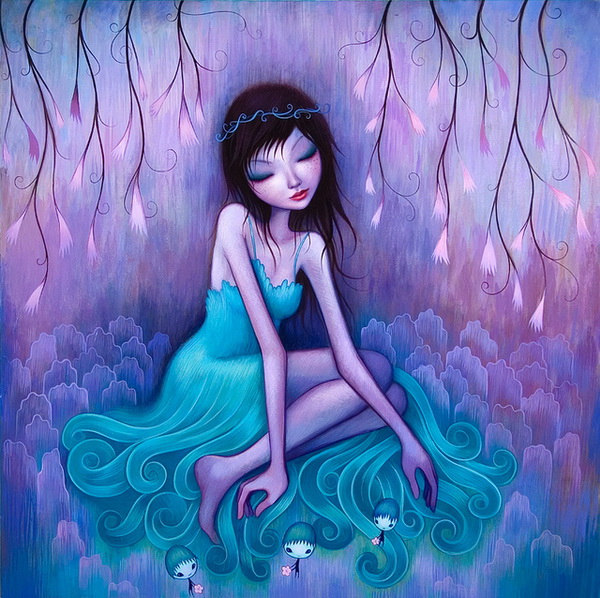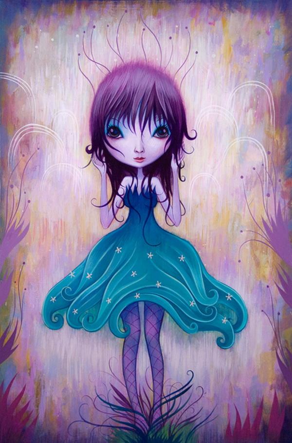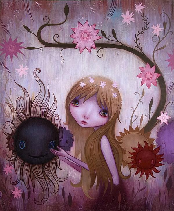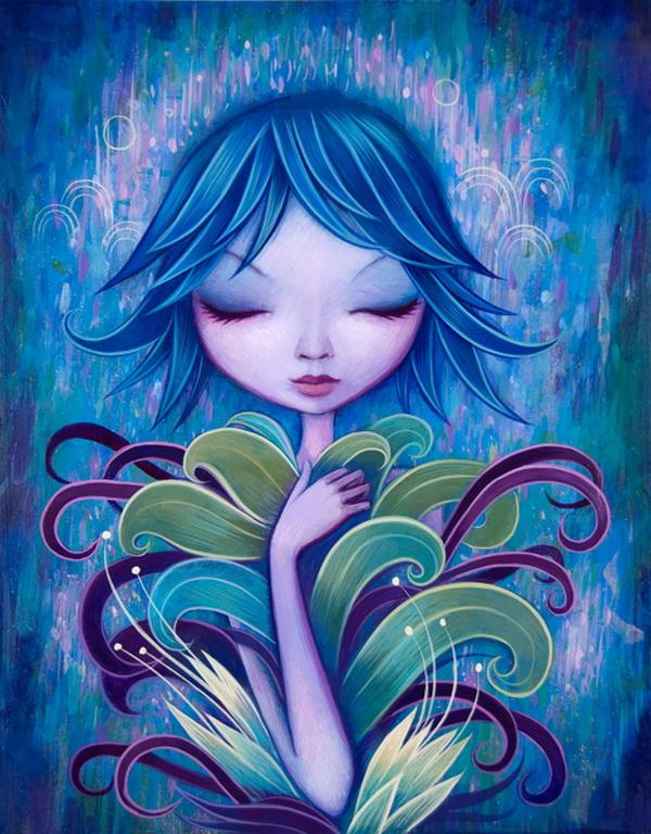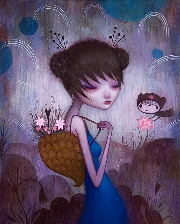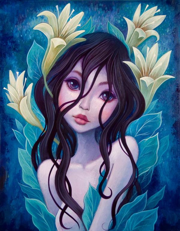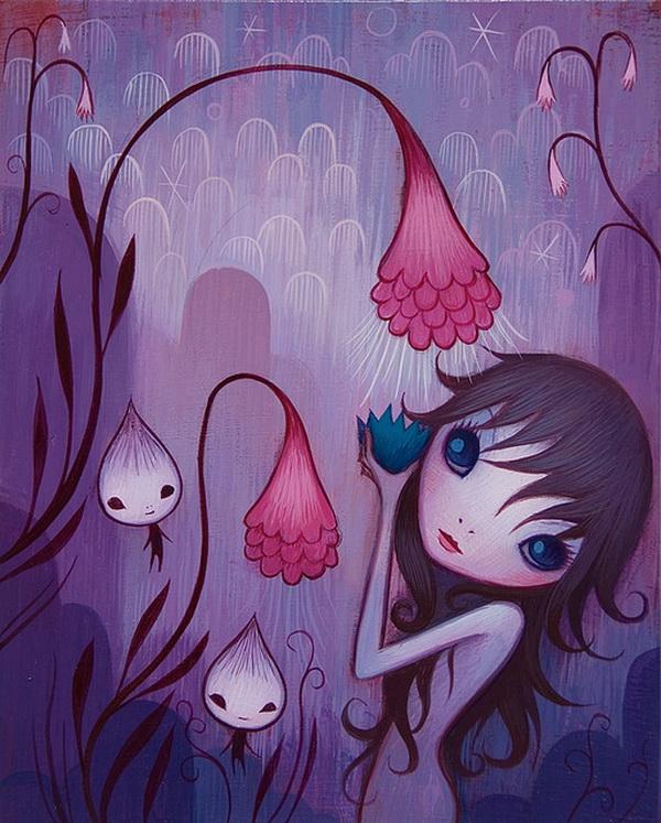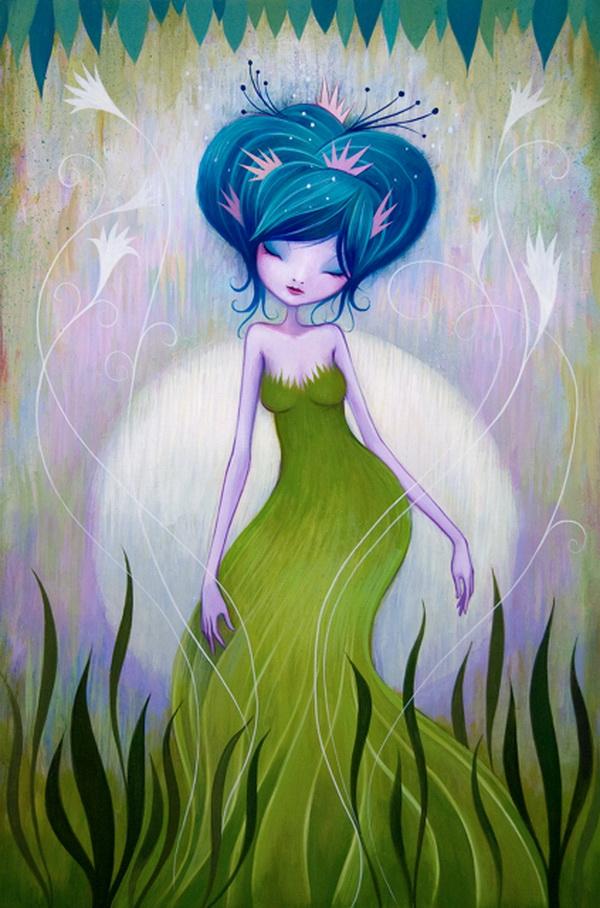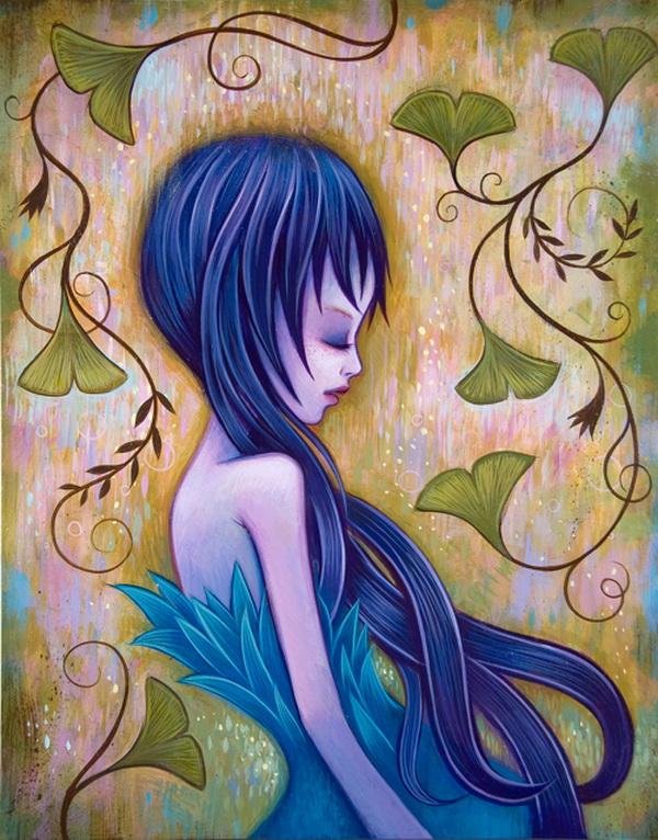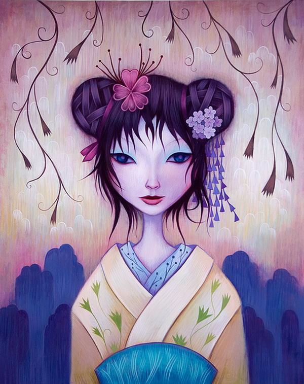 Chicago, Illinois based artist paints cute and whimsical fairytales with candy-floss landscapes and vivid colors. Jeremiah’s paintings are influenced by Japanese culture, the fabrics and mango as well as Art Nouveau, taking inspiration from the unruly aspects of the natural world.